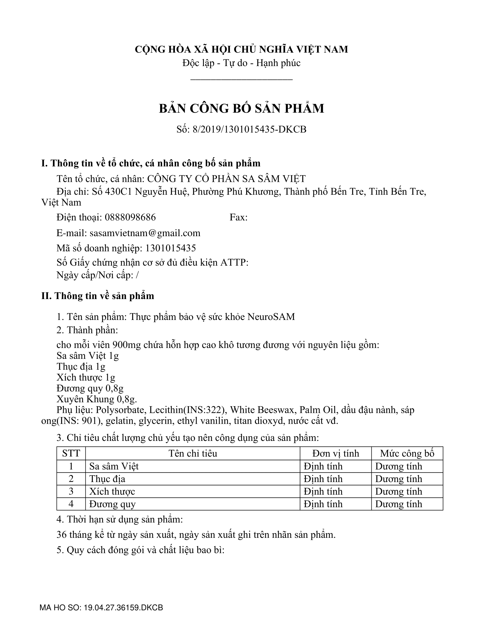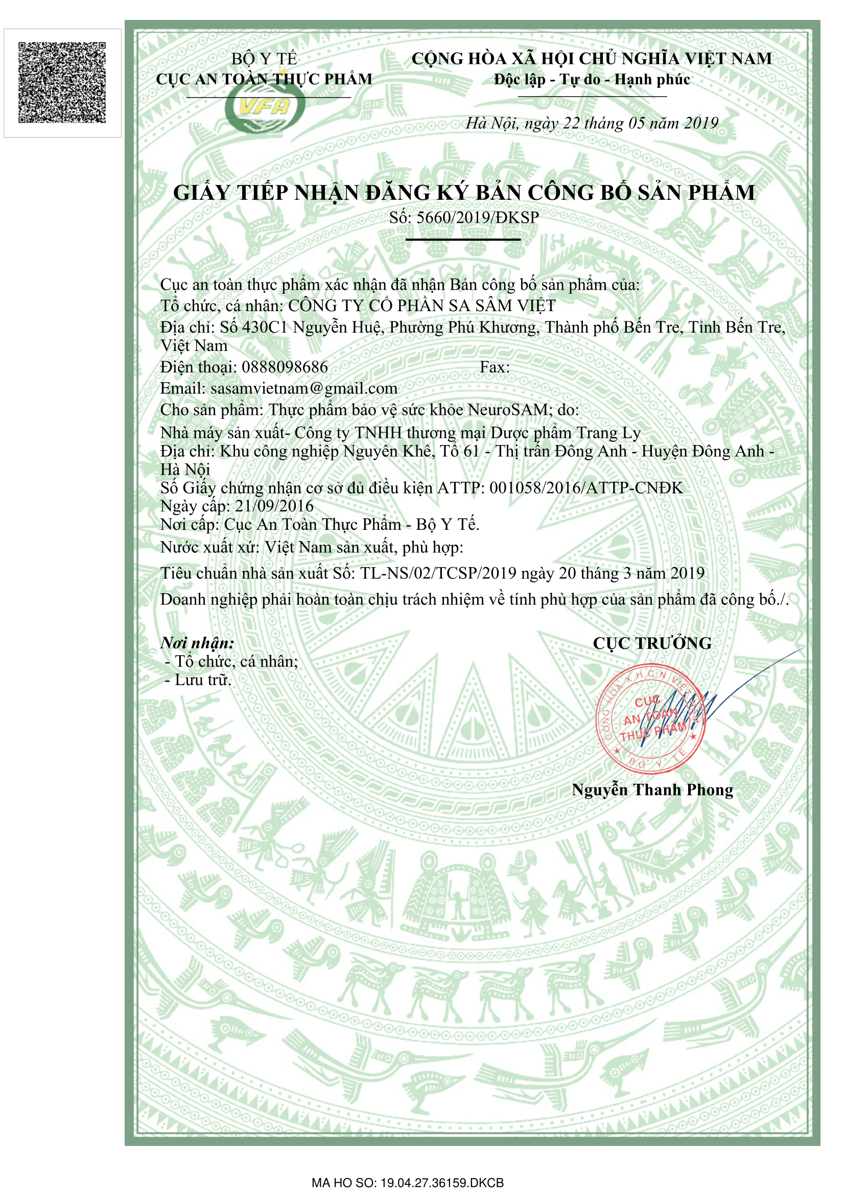 | Thông tin công bố sản phẩm | 5660/2019/ĐKSP |