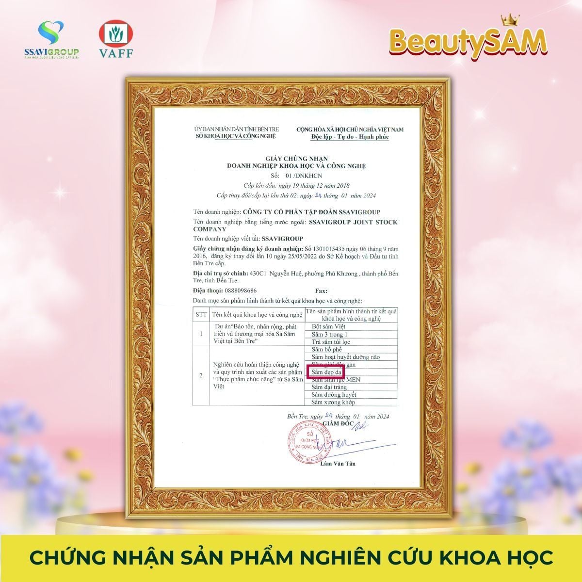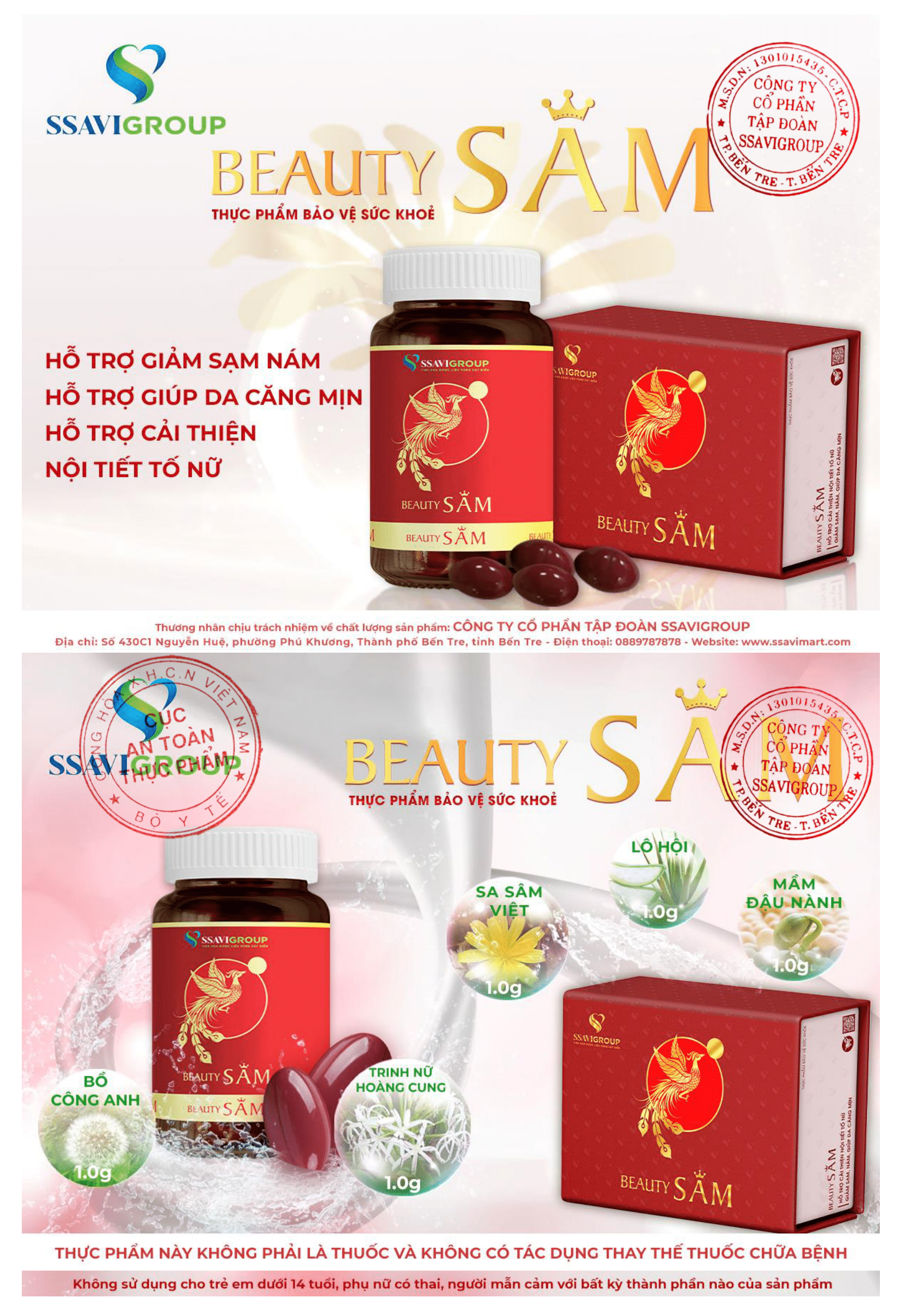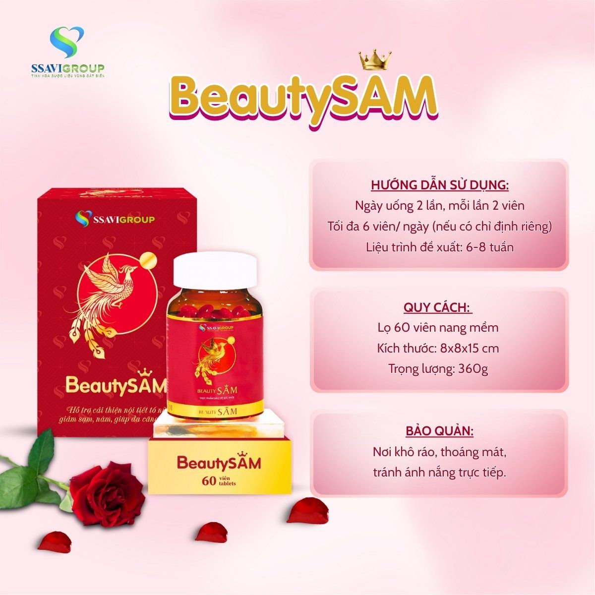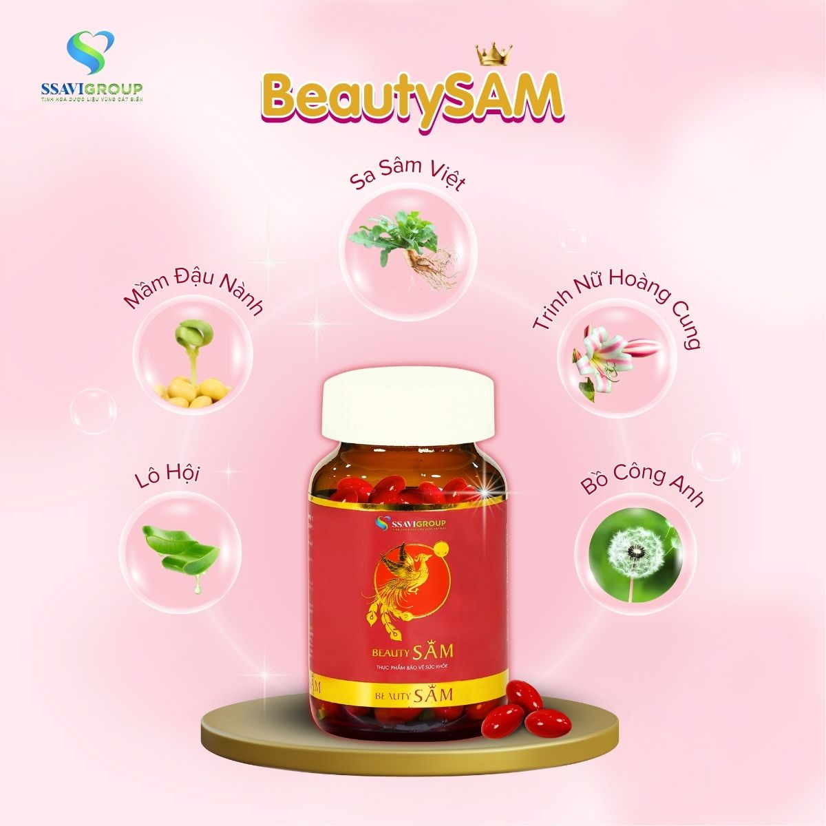 BeautySam do tập đoàn Ssavigroup - Doanh nghiệp khoa học công nghệ Việt Nam nghiên cứu, thành phần lên đến 22% "siêu dược liệu Sa Sâm Việt" có hàm lượng Saponin, Polyphenol, Flavonoid và nhiều khoáng chất thiên nhiên vượt trội so với những loại sâm danh tiếng trên thế giới, kết hợp mầm đậu nành, trinh nữ hoàng cung, bồ công anh, lô hội nhằm hỗ trợ cơ thể duy trì cân bằng nội tiết và vẻ ngoài tươi tắn cho phụ nữ từ tuổi dậy thì đến giai đoạn tiền mãn kinh.
